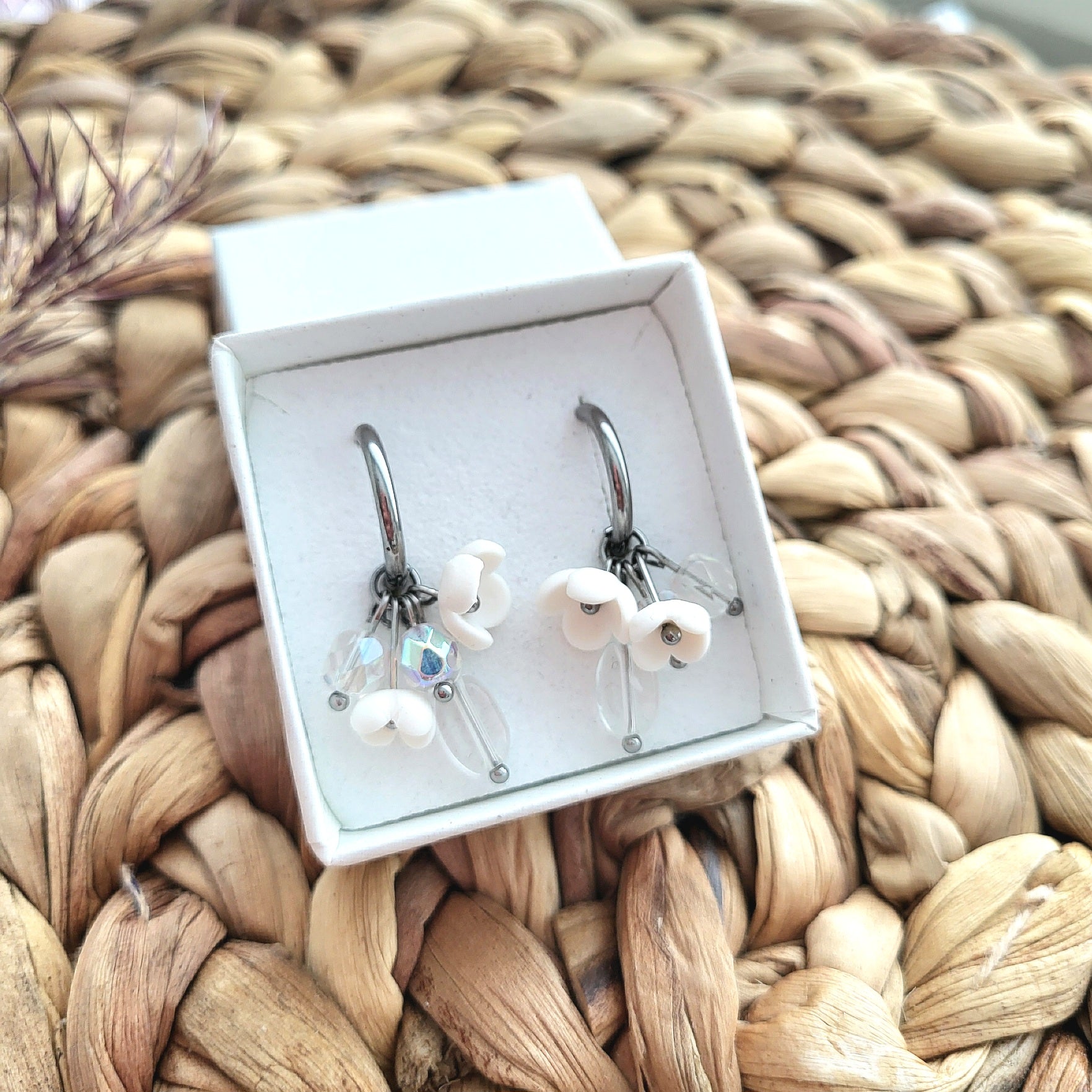 - Kauniin herkät Kielo korvakorut on valmistettu käsityönä polymeerimassasta ja helmistä.