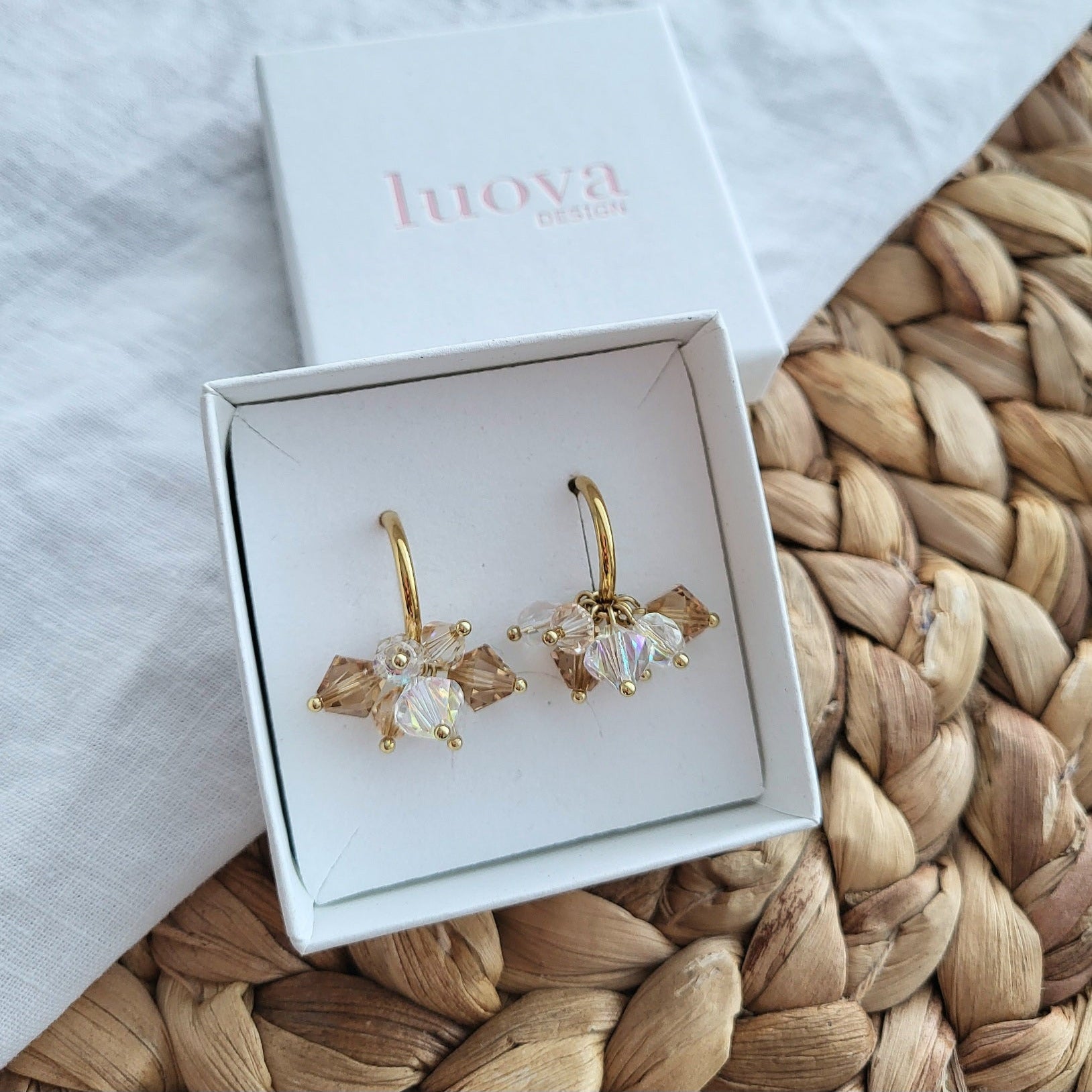 - Upeita erikokoisia Swarovskin kristallibicone-helmiä ja lasihelmiä huggie -renkaassa.